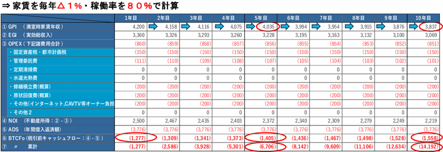 家賃年収についてですが、毎年家賃△1%、稼働率80%(空室約2.2か月)、以上の設定を行い初年度のCFを計算してみます。