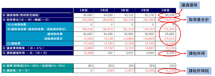 以下の表は、CFとは別に課税所得額を計算したシミュレーション表となります。