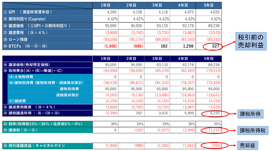 次に本物件を5年後に売却したことを想定した、売却益(キャピタルゲイン)のシミュレーションを見てみましょう。