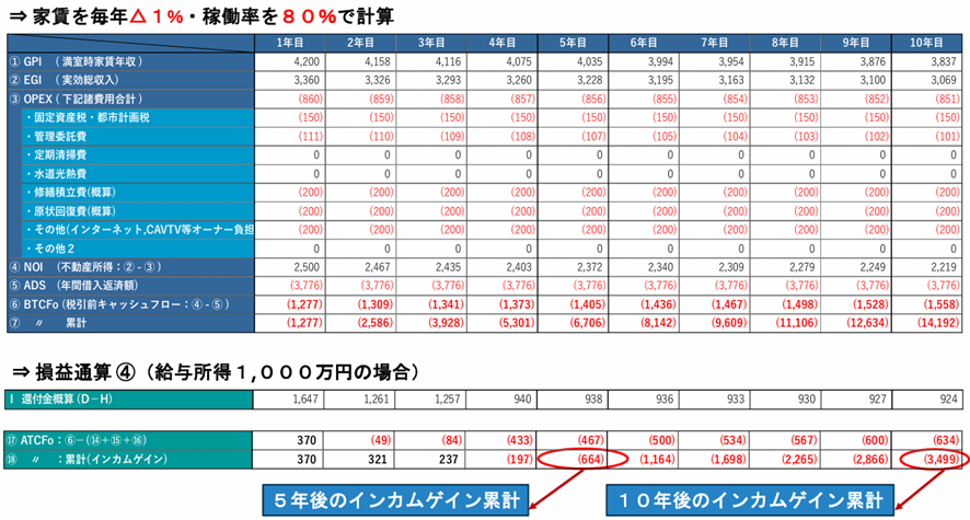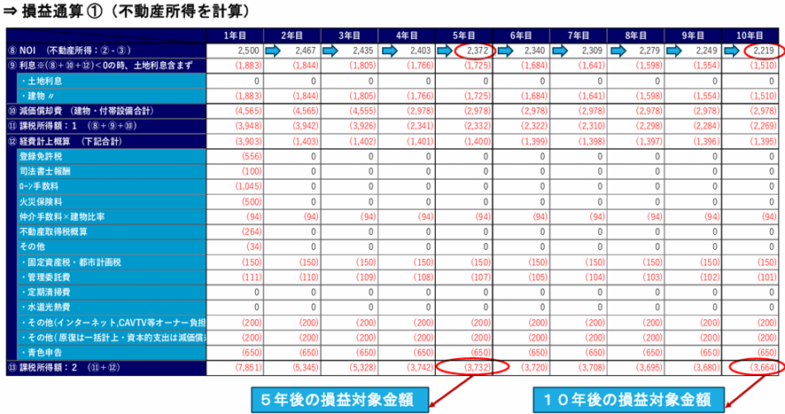 以上の表のように減価償却が大きく影響し、毎年の課税所得額は赤字計上することができ、5年後であれば△373万円/年、10年後であれば△366万円/年、の赤字計上が可能となります。