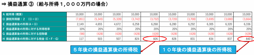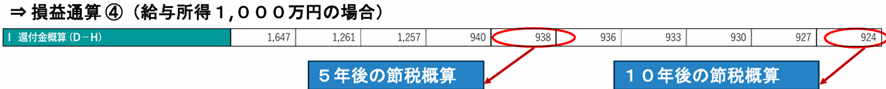 課税所得額:2をマイナス計上しことから、本来であれば、損益通算②の税金176万円/年を支払う必要があるところ、5年後は82万円/年、10年後は84万円/年に税金を抑えることができます。