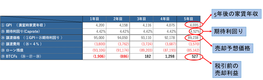 現在の表面利回は4.4%ですが、5年後はおそらく表面利回り4.5%でなければ売れないと仮定した場合・・・